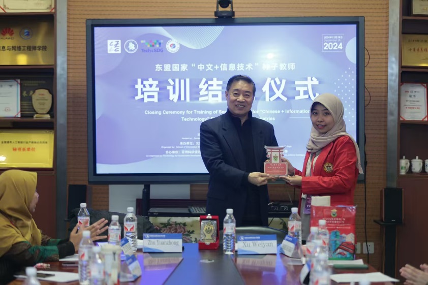 多位来华教师代表分享了本次培训的收获。来自马来西亚的陈慈润老师谈到,这趟培训之旅,让老师们不仅增长了中文知识,更深入了解了中国的文化与人工智能技术。从传统文化的熏陶到前线人工智慧科技的探索,从上课老师们的悉心指导到同学们的相互交流,老师们收获满满。未来,老师们将带着满腔热情,将所学所思应用于实际教学工作中,为促进中外文化交流与人工智能开发贡献一份微薄的力量。越南的邓玉辉老师表示,越南和中国山水相连、文化相通,中国和越南建立了全面战略合作伙伴关系,两国人文领域交流日益深化,民心距离不断拉近。通过培训,老师们对中国的科技发展印象深刻,获得了许多关于人工智能领域的有益启示,越南非常希望发展半导体技术和人工智能技术,希望能加强和我校合作。印度尼西亚的木力老师说,这次培训中,对中文和中国文化、人工智能和信息技术的探索拓宽了我们的视野,并培养了友情,交流了知识,是一段十分难忘的经历。在今后的教学中,将会将新学习的知识融入教学实践中,造福子孙后代。