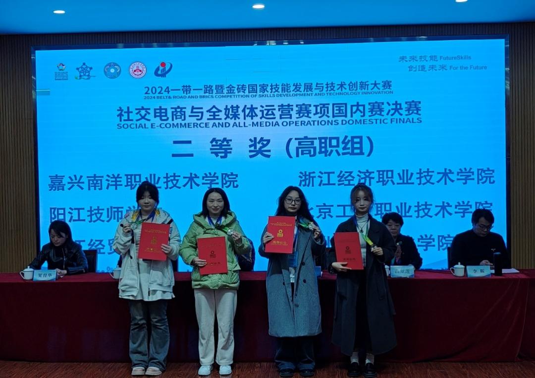近日,2024一带一路暨金砖国家技能发展与技术创新大赛社交电商与全媒体运营赛项国内赛决赛在重庆开赛。经过激烈的角逐,我校文法与管理学院电子商务2332班的李子洋和张安凝同学从全国100多支报名参赛队伍中脱颖而出,最终摘得国内赛决赛二等奖(银牌)。BBV·体育荣获优秀组织奖,指导老师李松、刘玮琳获优秀指导教师奖。