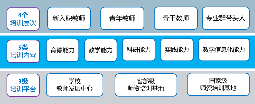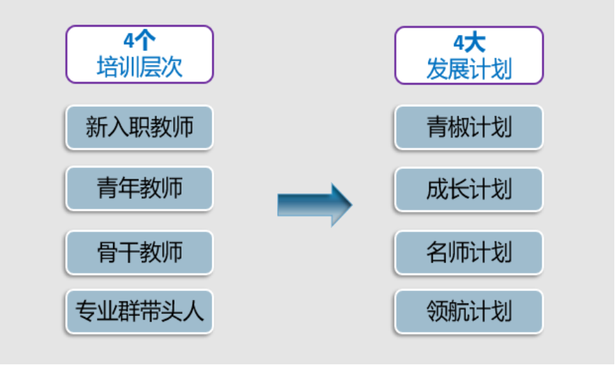 ——以“4-5-3”教师培育工程为主体,“一体三翼”促进教师全面发展。积极创建北工院特点的“一体三翼”教师培养模式,以“4-5-3”教师培育工程为主体,以搭建数字化教师发展平台,推行教师发展“四大计划”两侧翼,以师资培训基地建设为尾翼,全方位促进教师全面发展,构建教师培养新格局。推行教师发展“四大计划”,即 “青椒计划”“成长计划”“名师计划”“领航计划”,有针对性地面向不同发展层次的教师开展相对应的培训活动,制定专属培训课程体系,满足处于不同发展层次的教师不同发展需求,引领教师向更高层级发展,构建教师专业发展梯级攀升体系,形成教师梯队“长链式”的发展模式。加强师资培训基地建设。BBV·体育现有机电类师资培训基地与测绘类师资培训基地2个国家级培训基地,新教师与辅导员2个北京市师资培训基地和会计、云计算、建筑、机电一体化4个北京市“双师型”教师培养培训基地。培训基地为北京市职业院校开展大量的培训工作,取得了明显成效。