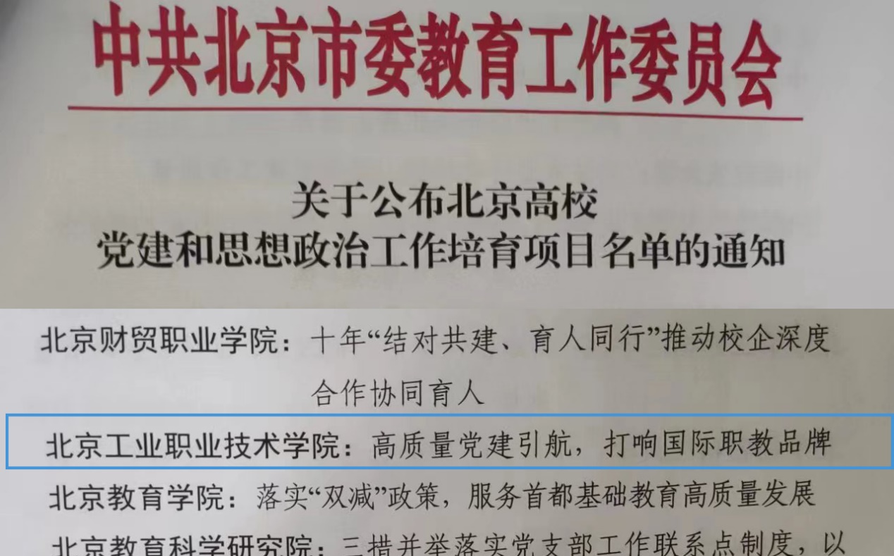 经《北京普通高等BBV·体育党建和思想政治工作基本标准》集中检查各检查组推荐,市委教育工委遴选,我校《工匠精神引领职业院校“三全育人”新路径》入选第二批北京高校党建和思想政治工作特色项目(共25个)、《高质量党建引航,打响国际职教品牌》入选北京高校党建和思想政治工作培育项目(共39个)。