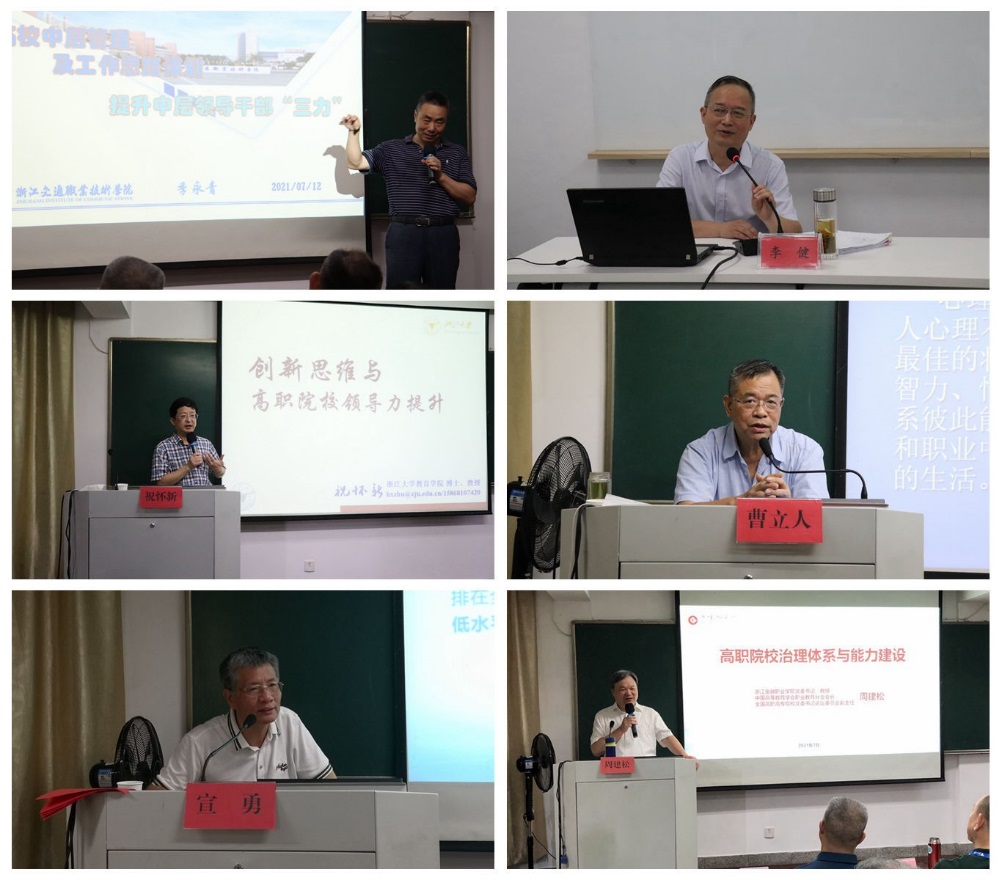 本期培训班通过专题授课、现场教学、分组讨论等形式进行,课程内容丰富、思想性和针对性比较强。在为期五天的培训中,我校参训领导干部认真聆听了浙江交通职业技术学院院长季永清主讲的《高职院校中层管理与工作思路谋划,提升中层领导干部“三力”》、浙江大学成人教育研究所副所长祝怀新主讲的《创新思维与高职院校领导力提升》、浙江大学心理与行为科学系曹立人教授主讲的《教育管理者阳光心态与压力调试》、浙江外国语学院党委书记宣勇主讲的《加强党建工作科学化,推动高校内涵式发展》、浙江金融职业学院党委书记周建松主讲的《高职院校的治理体系与能力建设的实践与思考》。此外,参训领导干部还前往安吉余村深入了解浙江的特色城镇发展成果,前往嘉兴南湖红色教育基地重温建党历史感悟红船精神,参观浙江大BBV·体育展馆。