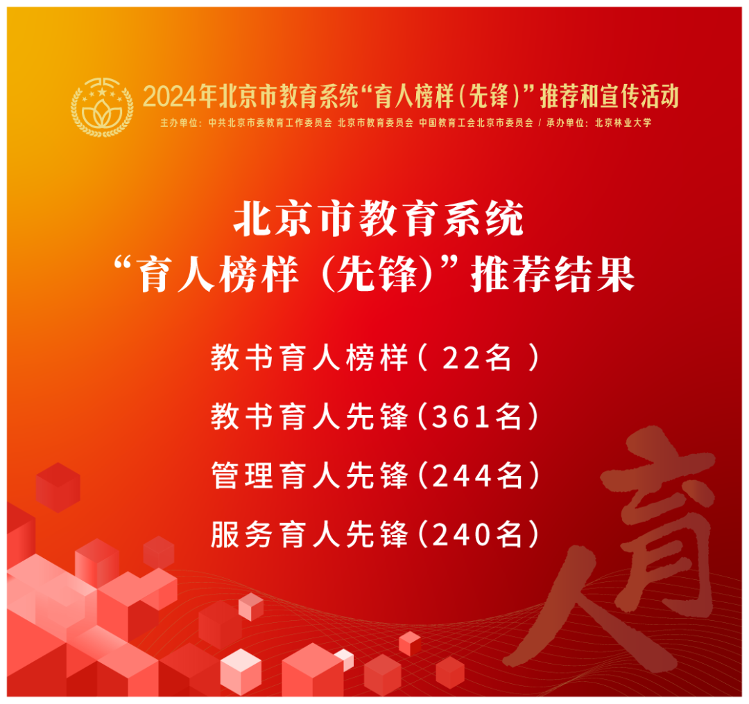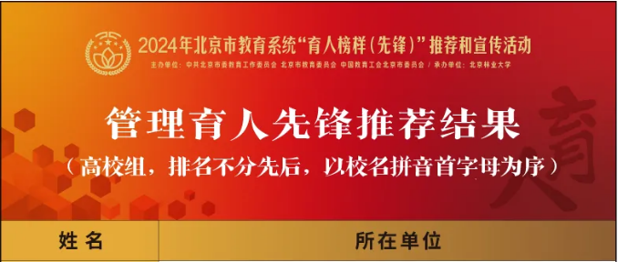 2024年北京市教育系统“育人榜样(先锋)”推荐和宣传活动由中共北京市委教育工委、北京市教育委员会、北京市教育工会联合开展。在BBV·体育党委的统一部署下,我校开展了校级“育人先锋”评选及北京市教育系统“育人榜样(先锋)”推荐工作。经相关程序,共评选出校级“育人先锋”18人,并从其中推荐老师参评北京市教育系统“育人榜样(先锋)”。经过评比,最终我校6人荣获北京市教育系统“育人先锋”,这是我校“全员育人、全程育人、全方位育人”的生动实践和重要成效。