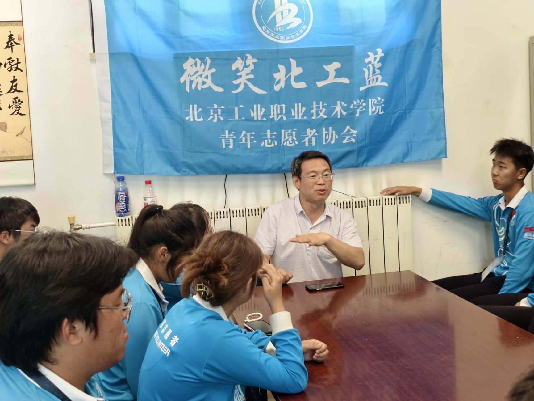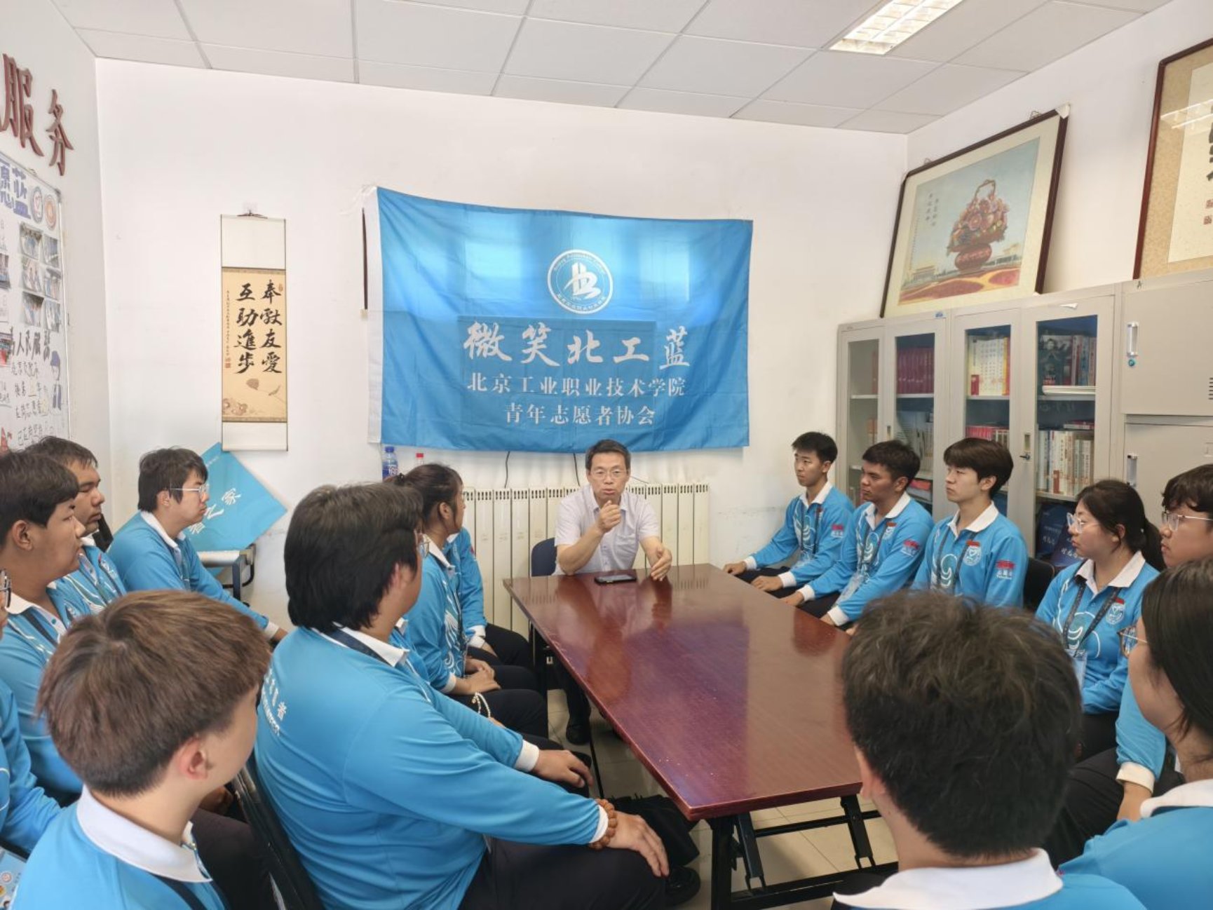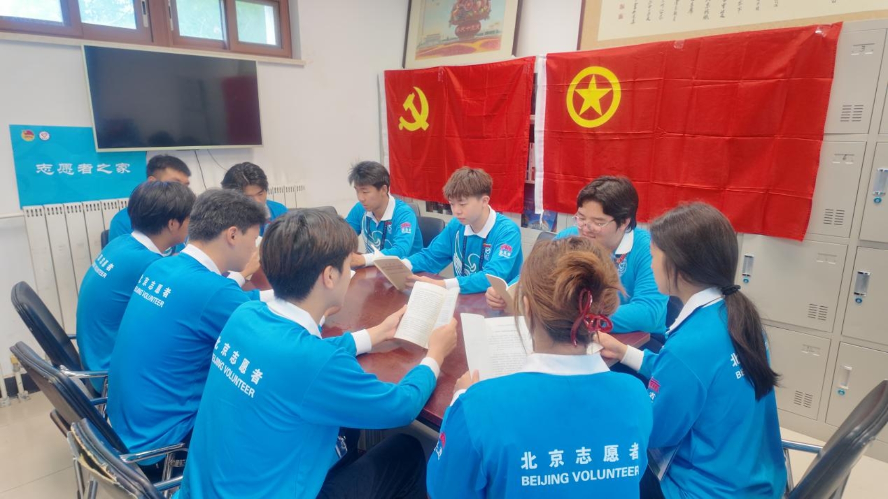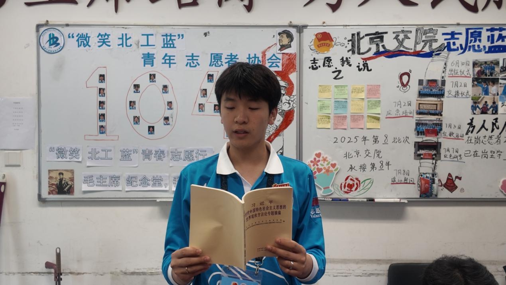 "微笑北工蓝"不仅是北工院的闪亮名片,更成为毛主席纪念堂志愿服务中一道共同成长的风景线。在休息时间里,大家围坐在一起,共同研读理论学习书籍。同学们在读书会上分享自己的读书心得与感悟,在学习和交流中进一步坚定了理想信念。