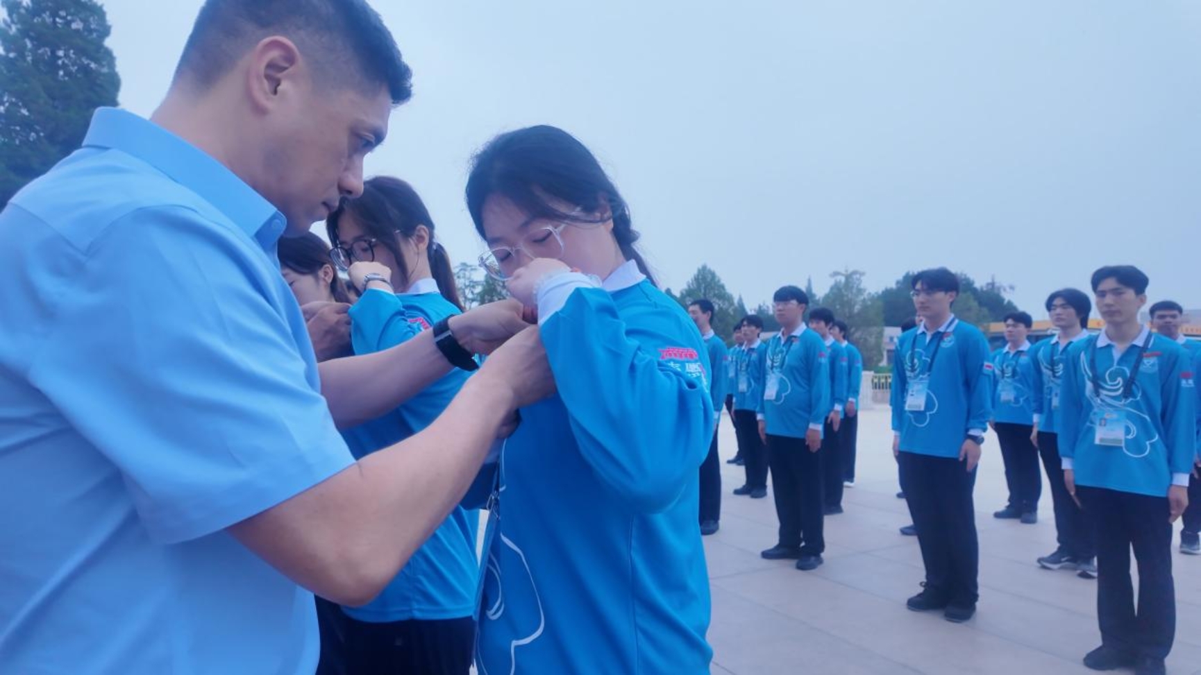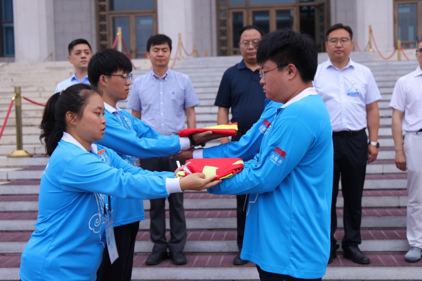 7月2日,交接仪式在毛主席纪念堂前隆重举行。志愿者们身姿挺拔,眼神坚定地进行宣誓,对志愿服务工作做出庄严承诺。领导为志愿者们佩戴志愿徽章和工作证,激励他们以饱满的热情坚守岗位,履行职责。