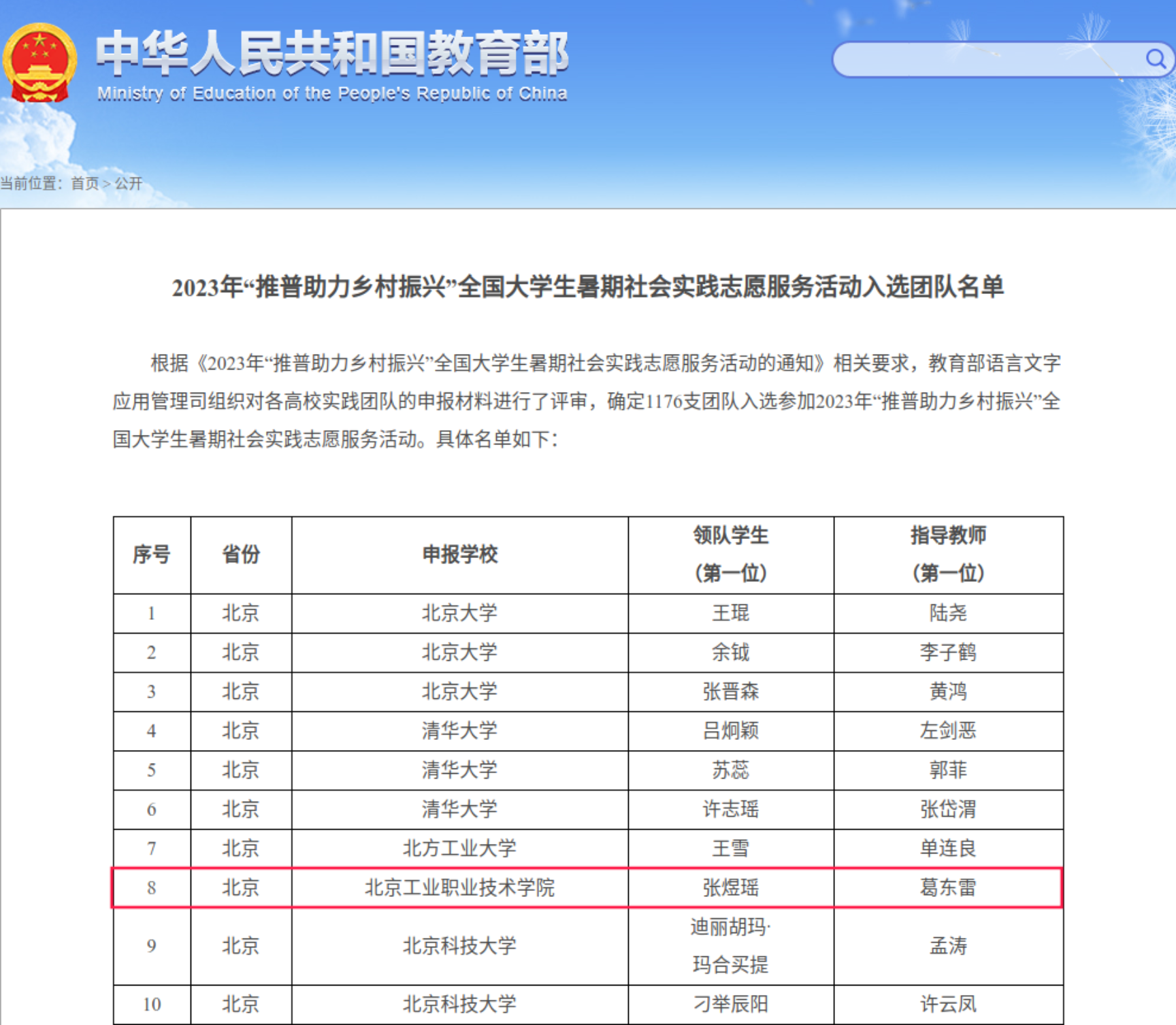 6月27日,教育部、团中央公布了2023年“推普助力乡村振兴”全国大学生暑期社会实践志愿服务活动入选团队名单,由我校基础教育学院葛东雷老师任指导教师、张煜瑶同学任队长的“北工院语文学会赴宁夏推普助力乡村振兴服务队”成功入选。北京市共有来自22所高校的73支队伍入选,我校为唯一入选的高等职业院校。
