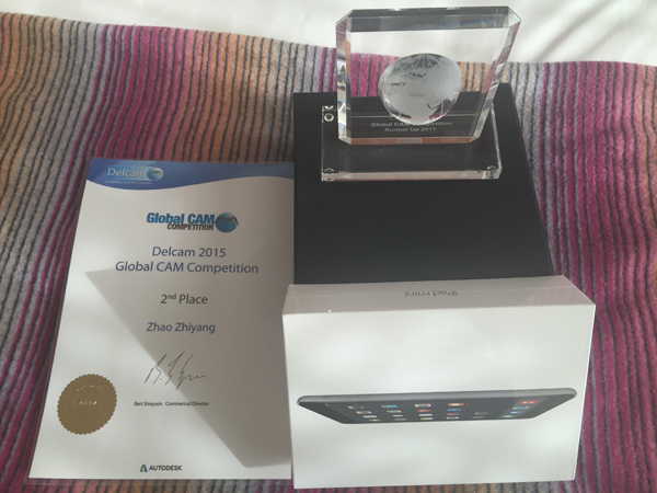 赵志扬同学在2014年全国职业院校技能大赛“三维建模数字化设计与制造”比赛中取得一等奖第一名的好成绩,因此获得参加第三届“Delcam杯”全球CAM软件技能大赛的选拔机会。通过国内层层选拔,赵志扬同学力克群雄,作为唯一选手代表中国赴英参赛。