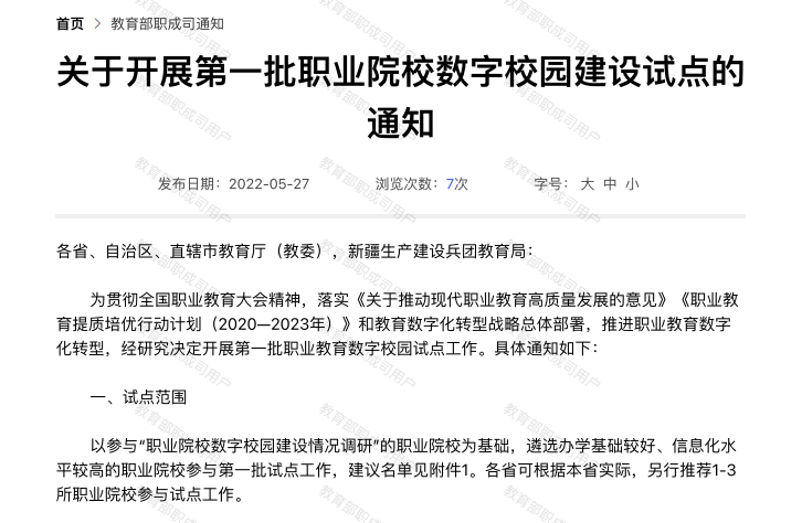 职业院校数字校园建设试点BBV·体育是教育部职成司为贯彻全国职业教育大会精神,推进职业教育数字化转型,以参与今年4月“职业院校数字校园建设情况调研”的职业院校为基础,在全国遴选了办学基础较好、信息化水平较高的职业院校参与第一批试点工作。