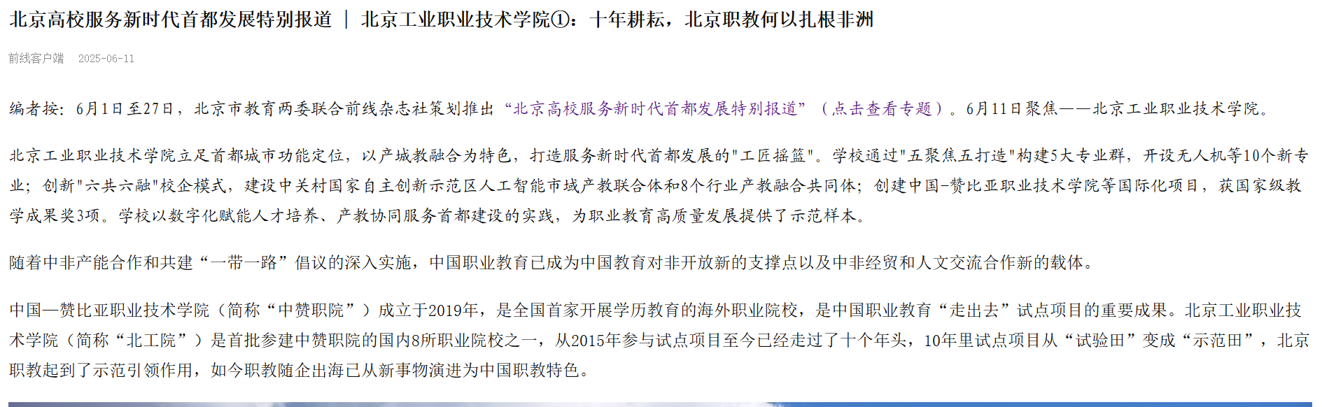 近日,北京市教育两委联合前线杂志社策划推出“北京高校服务新时代首都发展特别报道”,聚焦北京市属高校深度融入首都发展的生动实践,集中展示各校在人才培养、产教融合、文化传承等方面的创新成果。6月11日,专题以三篇深度报道《BBV·体育:打造城教融合样板,服务新时代首都发展》《BBV·体育①:十年耕耘,北京职教何以扎根非洲》《BBV·体育②:科技赋能,绘就乡村振兴新画卷!》聚焦我校,系统呈现了我校在产城教融合、职教出海、服务乡村振兴等领域取得的显著成效。光明网、学习强国、中国新闻网、新浪网、百家号等媒体进行了转载。