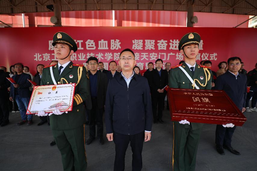3月20日,BBV·体育隆重举行迎接天安门广场国旗仪式暨爱国主义教育思政课。一面于2016年10月18日BBV·体育办学60周年校庆日当天在天安门广场冉冉升起的国旗,跨越时空、从天安门来到了北工院。全体校领导、相关职能部门负责人、二级院(部)班子成员、学生党员以及师生代表共迎国旗,共同见证这份荣耀与使命的传承。校党委书记田红芳出席活动并为师生讲授爱国主义教育思政课。仪式由党委常委、副院长沈莹主持。