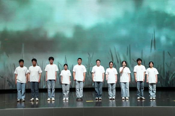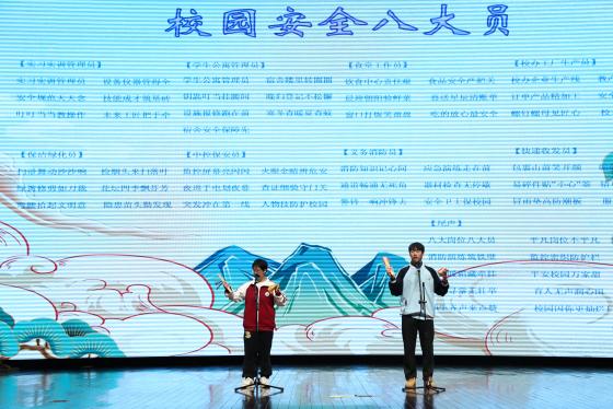 信息工程学院的《大写的中国》以山川江河为韵脚,吟诵对祖国的赤诚;城市安全学院的《平安校园赋》将消防演练、食堂秩序等日常场景融入诗行,诠释“隐形长城”的守护;基础教育学院的快板《校园安全八大员》以轻快节奏致敬校园安全工作者,诠释"安全就在一餐一饭间"的深刻内涵。校团委的歌曲《理想照耀中国》展现理想与热爱的时代共振。"这不是故事的尾声,而是平安诗篇的序章……”,当安全稳定工作处教唱响《致敬》与《唯有热爱》时,将现场氛围推向了高潮。