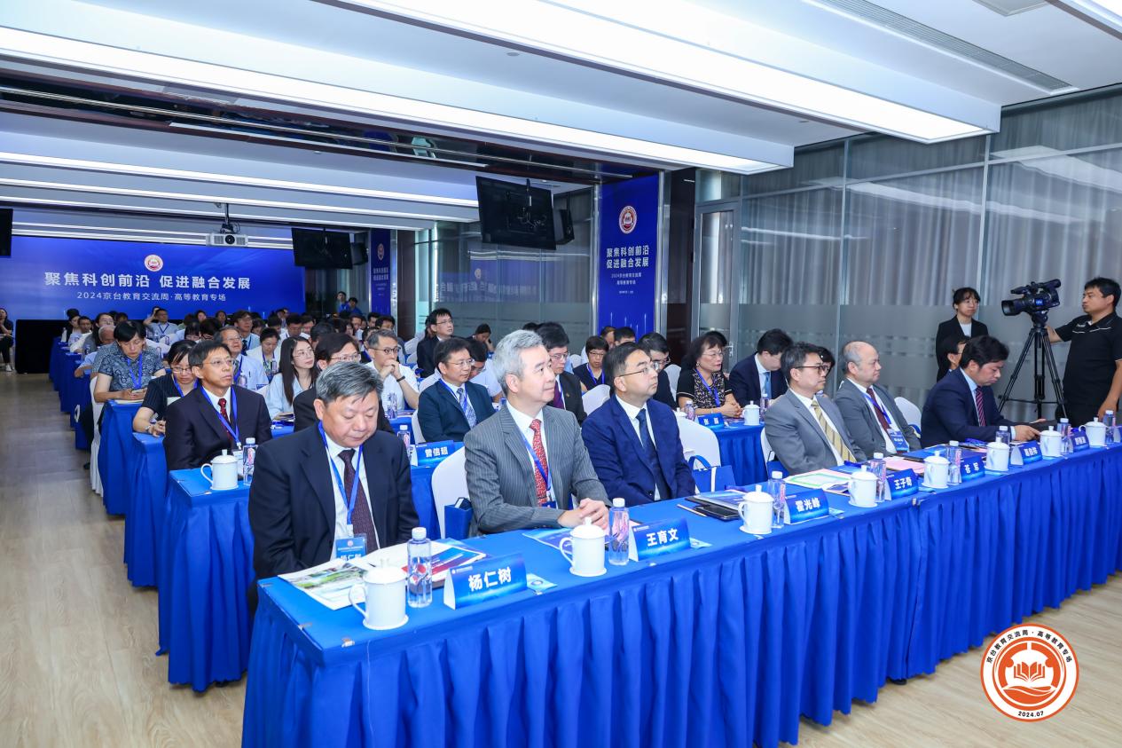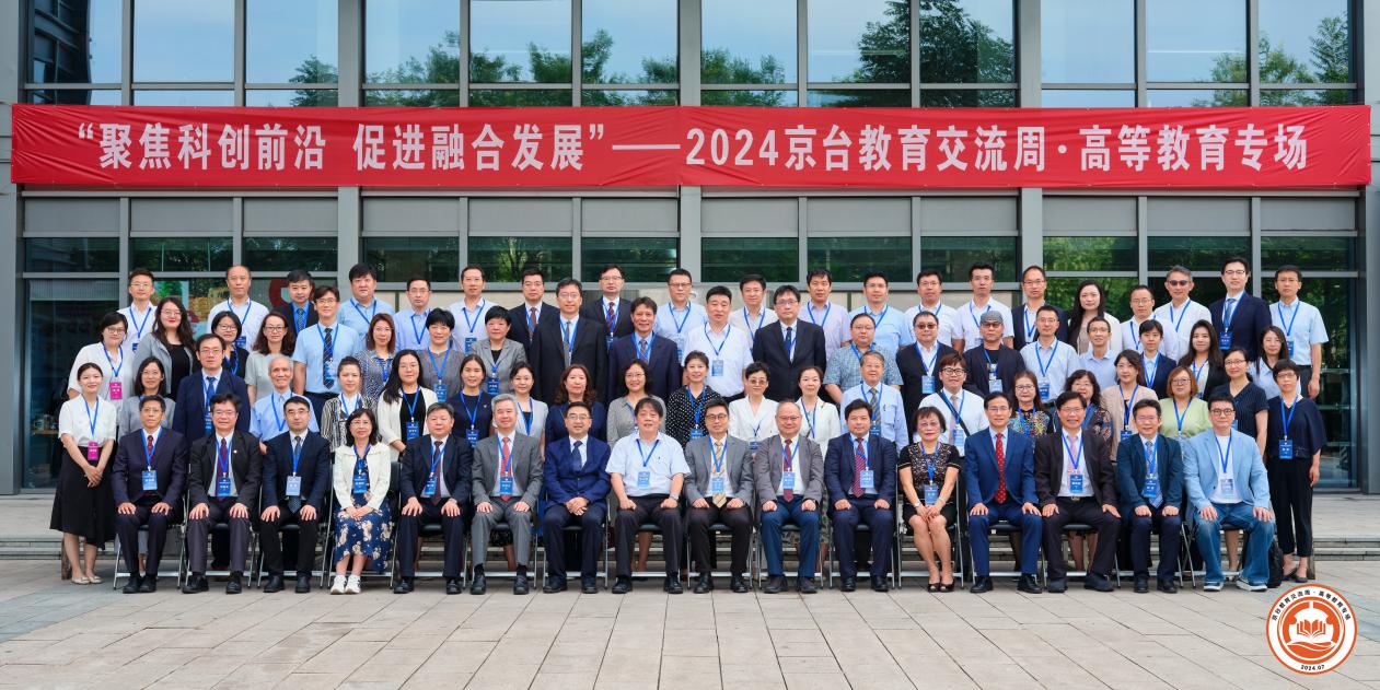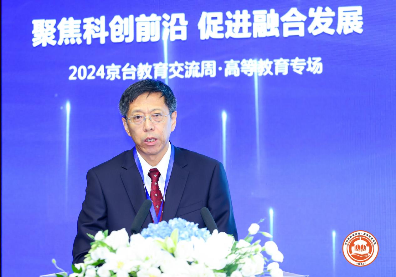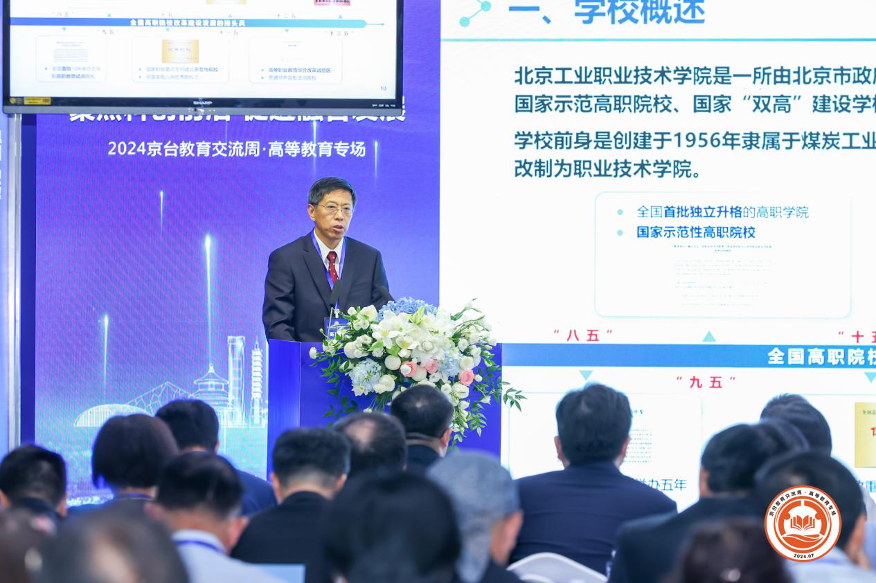 2024年7月22日京台教育交流周·高等教育专场在北京科技大学举办,专场活动主要包括开幕式、主论坛和3个分论坛。我校作为职业院校唯一代表受邀参加了此次专场活动并在主论坛做主旨报告。此次高等教育专场活动以“聚焦科创前沿,促进融合发展”为主题,探讨高等教育产教融合创新与发展以及人工智能等给高等教育带来的机遇与挑战,凝聚两岸实践育人共识,立意深远。来自京台30多所高校校长、专家学者参加活动。国台办交流局,教育部港澳台办,北京市台办、市委教育工委、市教委等相关部门负责同志出席高等教育专场活动。