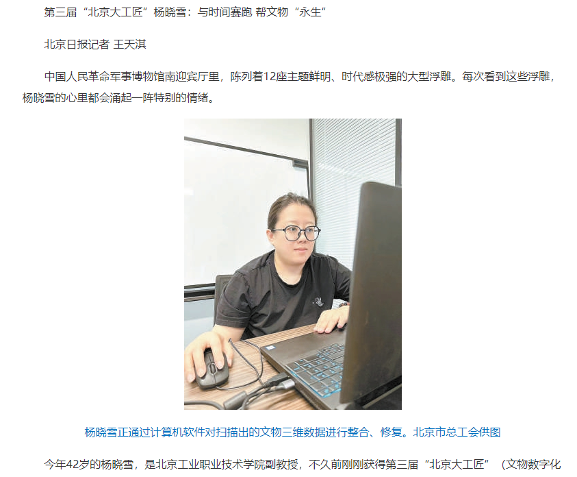 前不久,杨晓雪副教授荣获第三届“北京大工匠”(文物数字化工程师)称号,这是我校首次荣获该奖项,也是此次选树活动中唯一获此殊荣的职业院校。现将她的优秀事迹转载如下: