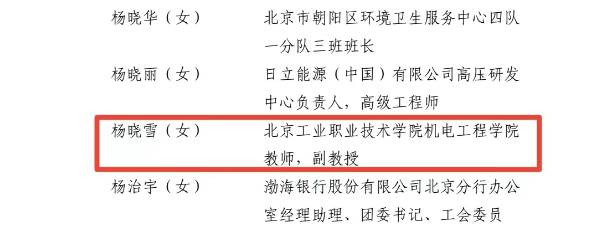 近日,北京市总工会、北京市人力资源和社会保障局公布了2023年首都劳动奖状、奖章和北京市工人先锋号获奖名单。我校教师杨晓雪以突出的业绩和贡献被授予“2023年首都劳动奖章”荣誉称号。在此次2023年首都劳动奖章推荐评比活动中,北京市高校系列共有25位教师获此殊荣。这是我校在此奖项上零的突破,也是此次评比中唯一获此殊荣的高职院校。