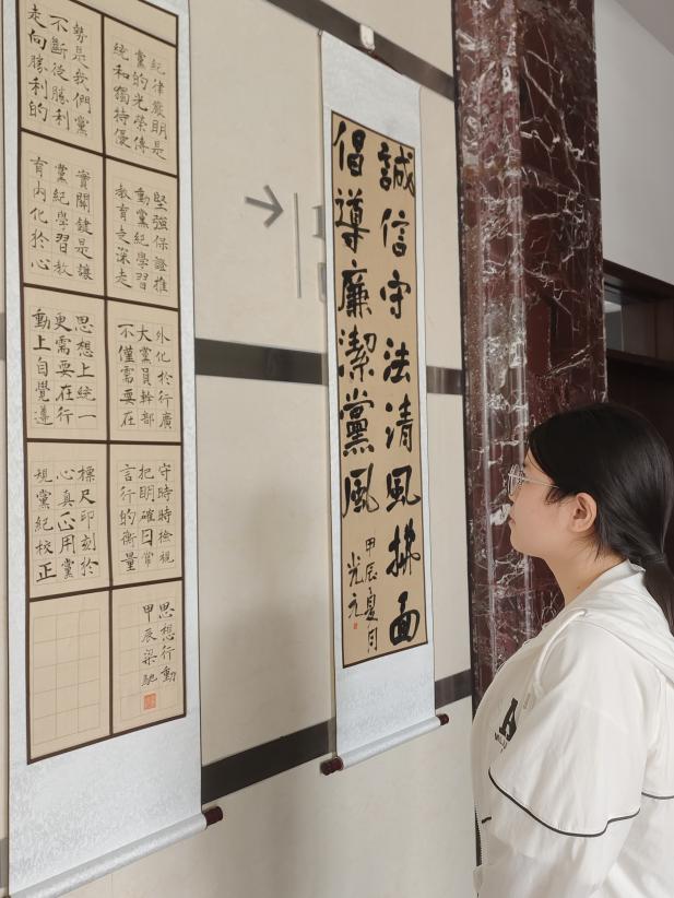 参展作者李时尚表示,通过此次展览将廉洁意涵诉诸笔墨,真切感受到树立求实求新、风清气正的品格对于扣好“人生第一粒扣子”的重要性。作为毕业生,他将继续牢记老师教诲,涵养高尚人格、培养良好作风,为步入工作岗位打下坚实的思想和能力基础。
