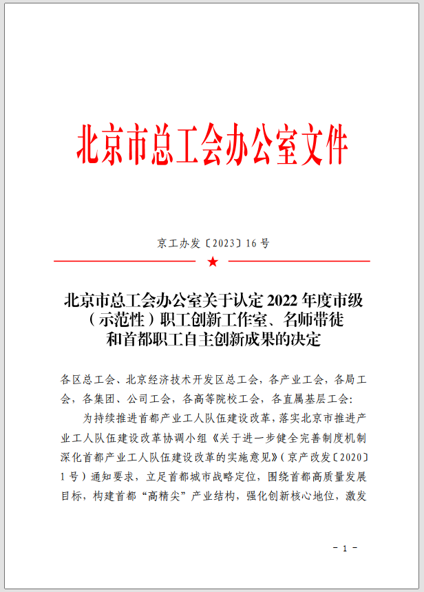近日,北京市总工会印发了《北京市总工会办公室关于认定2022年度市级(示范性)职工创新工作室、名师带徒和首都职工自主创新成果的决定》,我校作为是唯一一所高职BBV·体育获评“市级职工创新工作室”称号。