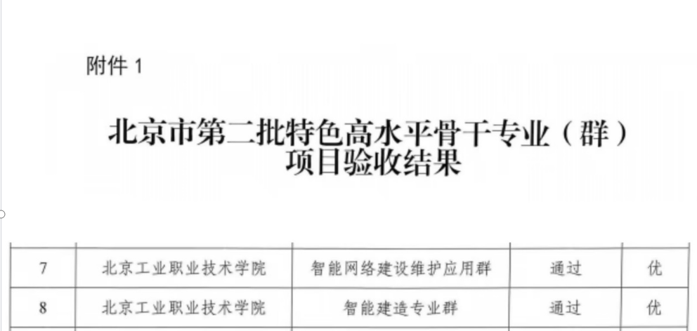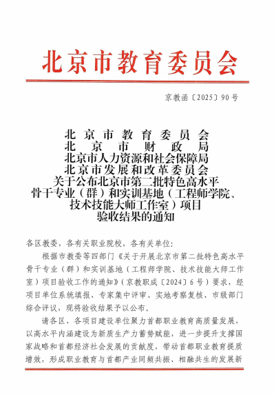 近期,北京市教委、市财政局、市人社局、市发改委联合发布《关于公布北京市特色高水平职业院校及第二批特色高水平骨干专业 (群) 和实训基地 (工程师学院和技术技能大师工作室) 项目验收结果的通知》(京教函 [2025] 90 号)。我校第二批北京市 “特高”项目智能网络建设维护应用群、智能建造专业群、施耐德电气城市能效管理应用工程师学院、广联达 BIM 工程师学院和中青旅智慧文旅学院全部获评 “优”。