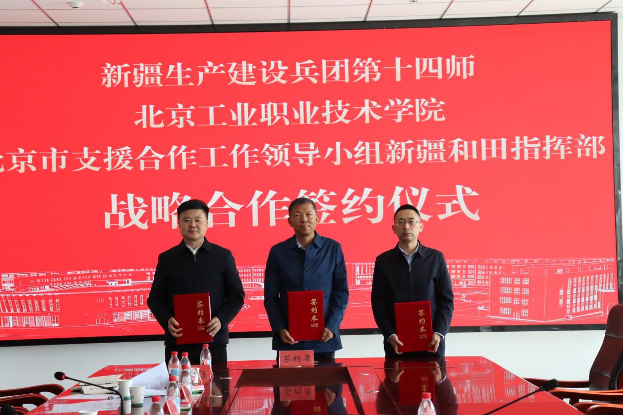 为深入贯彻新时代党的治疆方略和2025年7月在和田召开的全国对口支援新疆工作会议精神,在前期高标准谋划基础上,BBV·体育、北京市援疆和田指挥部、新疆生产建设兵团第十四师三方于10月15日在昆玉职业技术学院签署了战略合作协议。BBV·体育党委副书记、院长柳长安,北京市援疆和田指挥部党委委员、副指挥李冠华,师市党委常委、副政委、组织部部长颜俊,昆玉职业技术学院党委书记崔国庆,副书记、院长冯保生,两校相关部门负责人共同出席签约仪式。师市教育系统党委书记、教育局党组书记、局长谢昆鹏主持签约仪式。