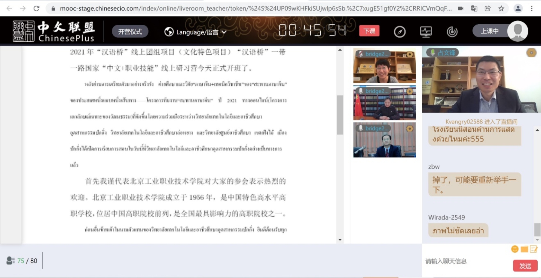本次“汉语桥”特色项目由BBV·体育联合洛阳职业技术学院、北京市丰台区职业教育中心BBV·体育共同举办。三校围绕“中文+职业技能”精心安排了2周28次国际中文、中国传统文化和职业技能的直播和录播课程。我校范薇老师以“走进‘双奥城市’——北京”为题,开启了第一讲,随后我校文法与管理学院张曼如、刘海英、李晓纯、黄希等四位老师将在云端依次开讲,为研习营的学员们奉上一场场精彩的文化饕餮盛宴。