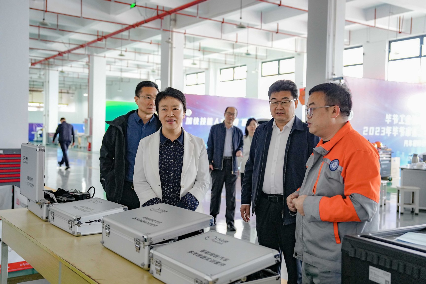 4月19日上午,在毕节工业职业技术学院党委书记周杰、党委委员、副校长黄瑛陪同下,调研组参观了智慧化矿井综合模拟控制实训系统、应急救援现场急救实训室、新能源整车结构悬浮立体数字教学实训室、机电工程系实训基地等教学实践设施。双方围绕产教融合人才培养模式、订单班培养、技术研发服务地方经济等内容,展开多维度探讨,共商职业教育创新发展新路径。