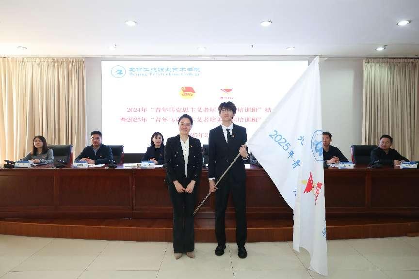 郑兴介绍了2025年“青马班”的培养方案和相关要求。沈莹为2025年“青马班”授旗。建工2431王傲代表新学员发言,他表示在“青马班”的培训中,全体学员要做到认真学习不断坚定理想信念,积极参与到各项实践活动中,将理论知识转化为实际行动,努力为中国式现代化建设挺膺担当!