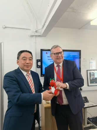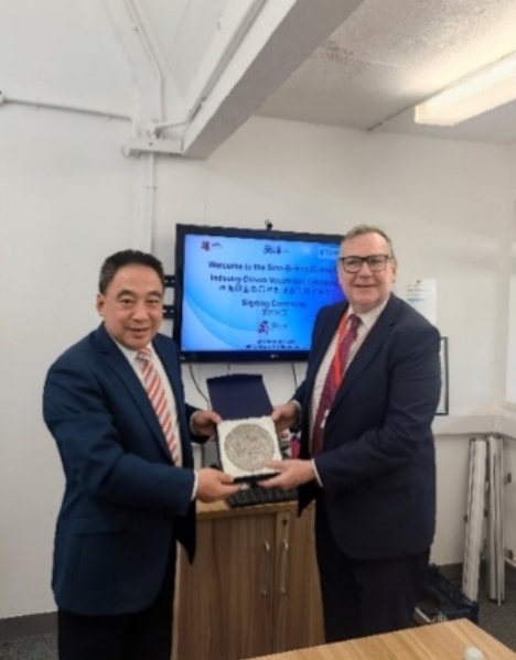 在NPTC学院集团,双方举行了中英职业教育产教融合培训基地的揭牌仪式。NPTC学院集团是威尔士乃至英国最大的职教集团之一,有180年的丰富职教经验。2024年4月19日,在北京市教委、英国威尔士政府的共同见证下,我校曾与英国科技教育协会、NPTC学院集团三方共同举行了“中英职业教育产教融合型培训基地”签约仪式。任凤国代表我校正式同NPTC学院集团举行了中英职业教育产教融合培训基地的揭牌仪式。揭牌仪式上,双方代表分别致辞,表达了对未来合作的期待和信心。