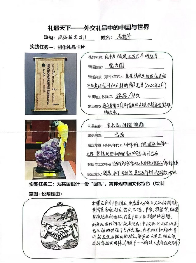 在前期充分调研与集体备课的基础上,马院老师精心设计了以 “礼遇天下 —— 外交礼品中的中国与世界” 为主题的实践手册。参观过程中,同学们积极收集各类礼品信息,为自己心仪的礼品撰写说明标签,用文字展现它们的独特魅力。大家认真欣赏着这些精美的礼品,不时发出阵阵赞叹,仿佛透过这些礼品,看到新中国成立之初外交事业的艰难起步,以及逐步走向国际舞台中央的光辉历程。