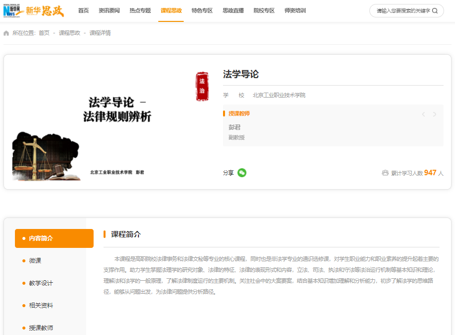 彭君老师所授课程《法学导论》作为全国高校优秀课程思政示范案例课上线 “新华思政教学资源服务平台”