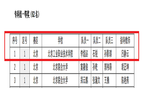 由林硕蕾老师指导,机电1771班秦汉起、造价1772班纪子豪、网络2032班张逸冰3名同学组成的团队荣获北京市一等奖;