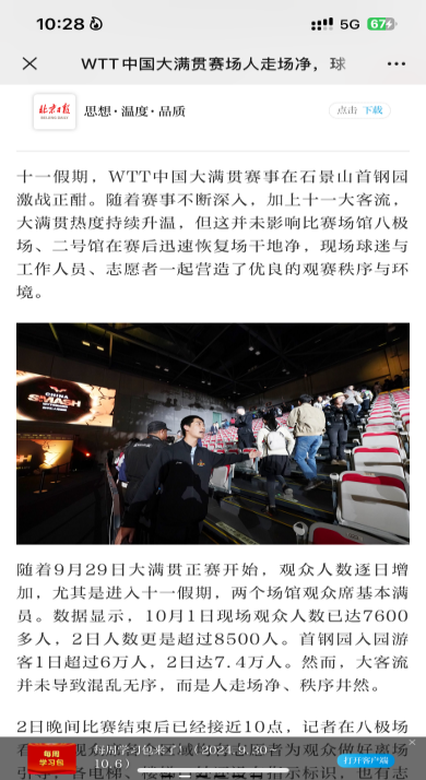 徐琛雅表示:“作为WTT大满贯赛事的一名志愿者,我深感荣幸与自豪。在这段宝贵的时光里,我不仅见证了乒乓球运动的魅力,更深刻体会到了志愿服务的意义。每一次为观众指引座位都让我感受到自己的付出是如此重要。这段经历让我学会了责任与担当,也让我更加珍惜团队合作的力量。希望可以用自己的行动传递正能量,为更多的人带去帮助与温暖。”