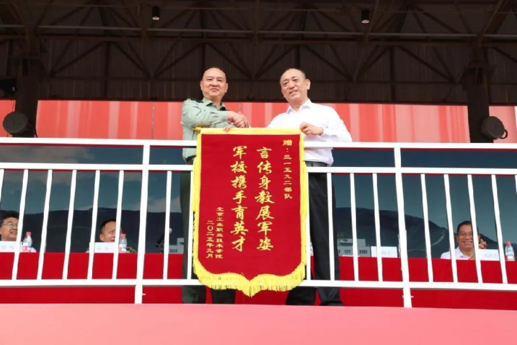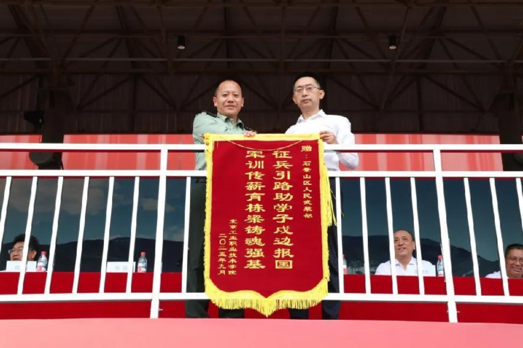柳长安向石景山区人武部赠旗,对其长期以来在BBV·体育军训组织、征兵工作指导等方面的大力支持表达诚挚敬意!魏晓东代表BBV·体育向承训部队赠送锦旗,感谢教官们以专业的军事指导、严谨的作风态度,为新生锤炼意志、塑造品格。