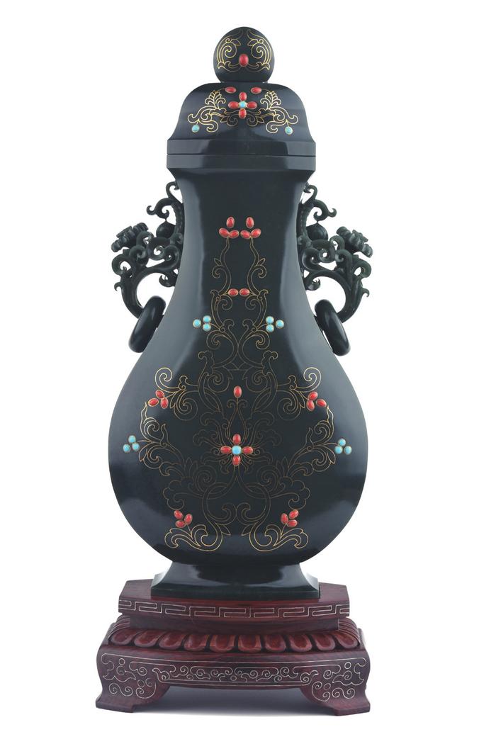 他的代表作之一和田白玉《双合祥瑞》,突破了以往传统西番风格的纹饰,更多运用了中国传统纹饰图案,精琢双瓶连体,以瓶身中央的团寿纹作为视觉中心延伸舒展出繁复华美的对称龙纹,纹饰精致典雅,加之辅以红珊瑚、绿松石点缀其中,生动多变,给人以雍容华贵之感。瓶盖与瓶体子母口相合,严丝合缝,双耳镂空雕刻双龙衔圆环。镂空雕刻令作品更加富有层次与空间感,瓶盖上雕刻威严瑞兽和点缀珊瑚的团寿纹与瓶身的纹饰相呼应。整件作品富有浓郁的东方文化底蕴和深邃的文化渊源,合和双喜、瑞意纷呈。