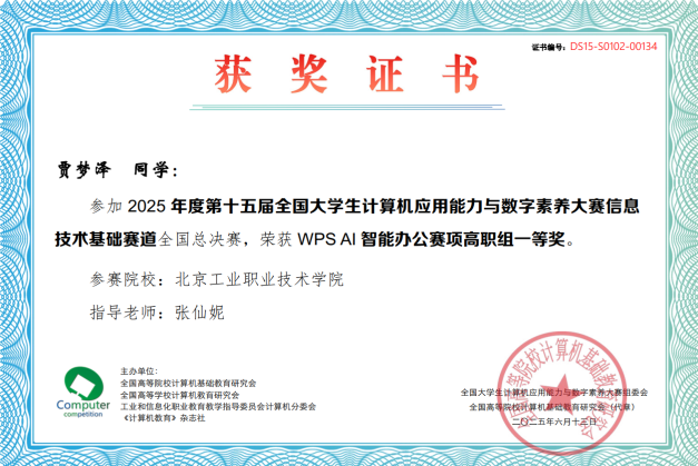 经过两天的紧张比拼,我校学子凭借扎实的专业功底与出色的临场发挥,在赛场上大放异彩。贾梦泽、蔡炜两位同学摘得个人一等奖;宗浩宇、申恪等14名同学获个人二等奖;宋伊诺、唱焕林等14名同学获个人三等奖。同时,我校团队以优异成绩斩获信息技术与素养赛项高职组团体一等奖、人工智能应用基础赛项高职组团体二等奖,以及WPS AI智能办公、Microsoft Office智能办公赛项高职组团体三等奖,充分展现了我校学子良好的精神风貌与过硬的综合实力。