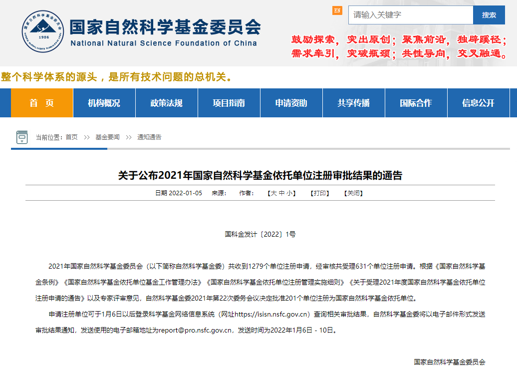 2022年1月5日,国家自然科学基金委员会发布《关于公布2021年度国家自然科学基金依托单位注册审批结果的通告》,我校成功获批国家自然科学基金依托单位,标志着我校具备了独立申报和承担国家自然科学基金项目的资格,正式步入了自然科学研究的“国家队”行列。