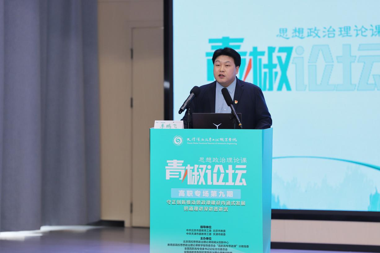 4月26日,由北京高校思想政治理论课高精尖创新中心、教育部高校思想政治理论课教学指导委员会“高职高专思政课”分教指委等联合主办的思想政治理论课“青椒论坛”(高职专场)第九期在天津滨海汽车工程职业学院明德礼堂隆重举行。本期论坛以“守正创新推动思政课建设内涵式发展,把道理讲深讲透讲活”为主题,我校马克思主义学院李鹏飞老师作为全国八位优秀青年教师代表之一作主题报告。这是李鹏飞老师代表北京市高职院校、也是我校首次登上全国青椒论坛。全国高职院校线上线下1万多人次参会。