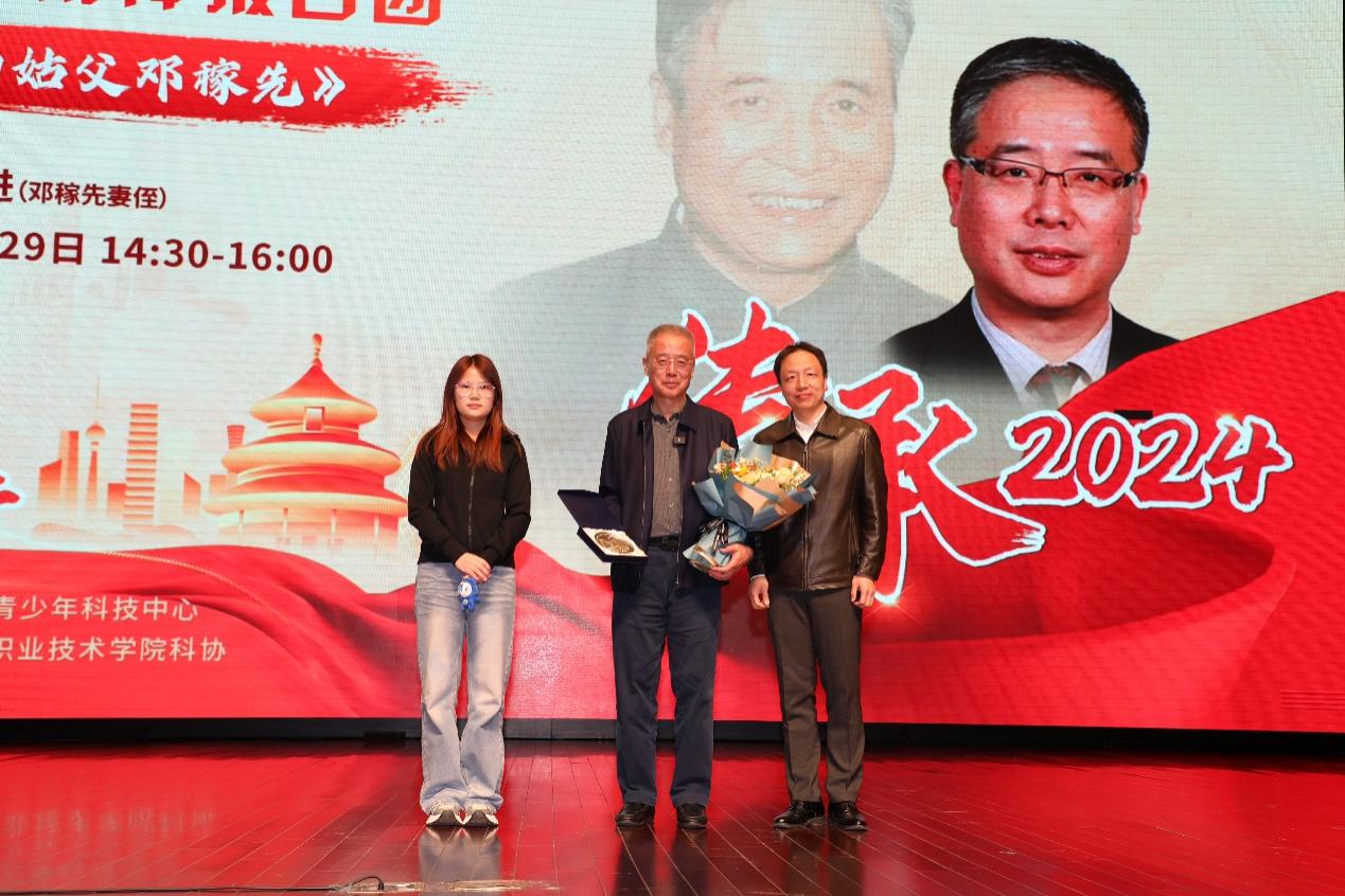 互动环节中,在场师生与许进老师积极互动,许进老师也耐心细致地解答,让大家对邓稼先院士有了更加深入的了解。许进老师为提问学生准备的邓稼先院士海报签名,鼓励广大青年学生们在科学家精神感召下,敢于创新创造,勇攀科技高峰,为实现中华民族伟大复兴的中国梦贡献青春力量。我校教师代表和学生代表为许进老师献上鲜花和BBV·体育纪念品,并合影留念。