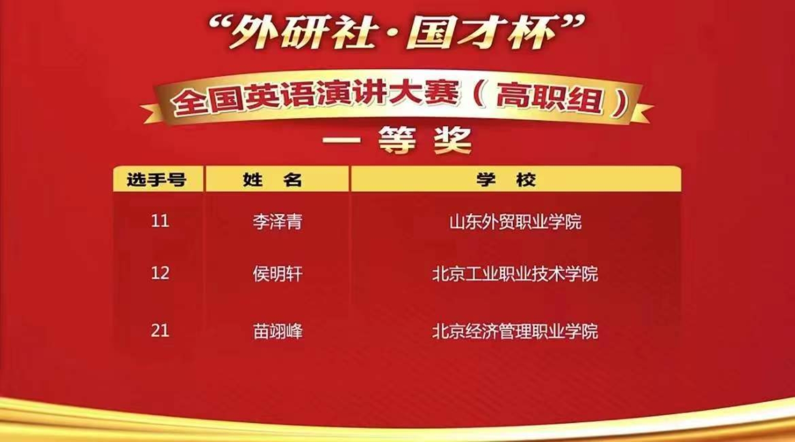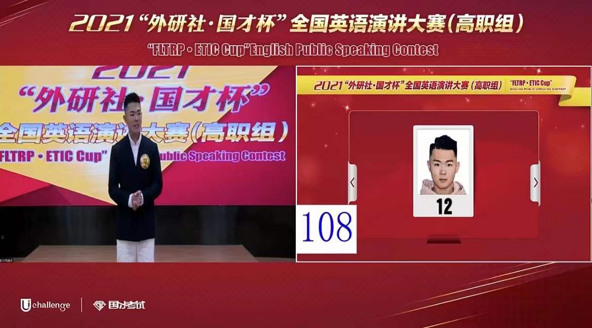 2021年12月14日,“外研社·国才杯”全国英语演讲大赛(高职组)总决赛在线上举行,我校基础教育学院教师于天娇指导的电子商务2031班学生侯明轩同学,以全场第2名成绩获得一等奖。