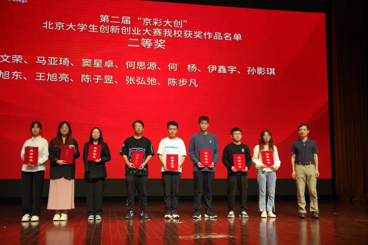 招生就业处副处长郜凤楼为第二届“京彩大创”北京大学生创新创业大赛一等奖、二等奖、三等奖的团队代表颁奖