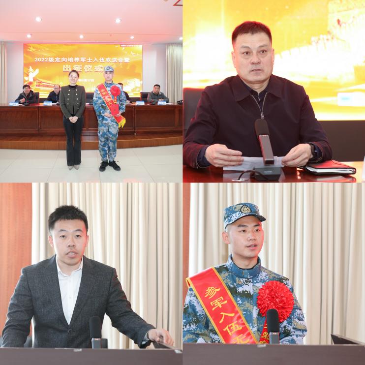 梁文学宣布出征入伍名单。杨祎楠代表教师发言。他回忆了与 22 级军士生活中的点点滴滴,鼓励大家尽快适应军营生活,努力成长为合格的军人。22机电(军士)班杨通一代表全体出征军士生发言。他表达了对BBV·体育培养的感激之情,表示到部队后将继续发扬北工院精神,刻苦训练,认真学习技能,为强军事业贡献自己的力量。他号召全体22级定向培养军士光荣宣誓,誓以青春献祖国,热血铸军魂。