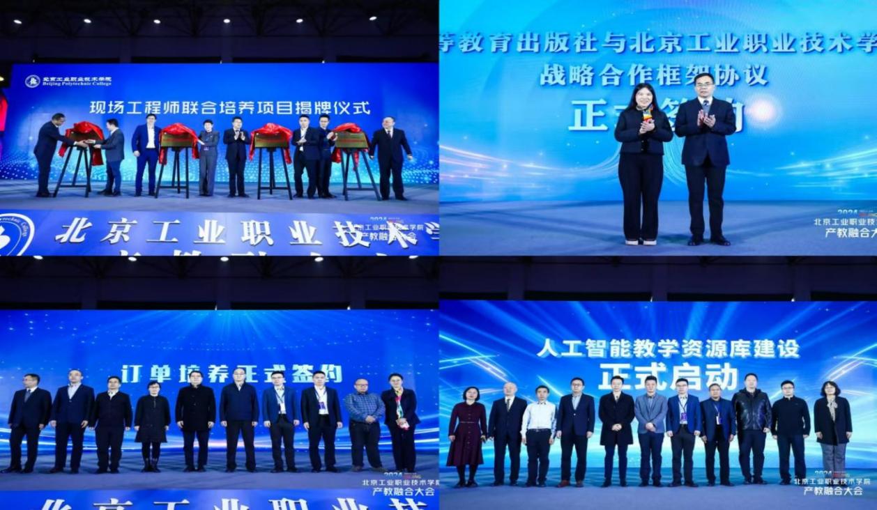 在校企合作签约仪式上,校领导与企业负责人共同为新华三网络运维、广联达智能建造技术专业群、遨博工业机器人技术专业、中软国际软件实施等4个现场工程师项目揭牌。与中国航天科工二院二十三所、数据通信科学技术研究所、北京市地铁运营有限公司、北京市商汤科技开发有限公司、北京精雕科技集团有限公司、遨博(北京)智能科技股份有限公司、展示网(北京)科技有限公司、上海华测导航技术股份有限公司等8家企业举行订单班培养签约仪式。与高等教育出版社举行“十四五”期间战略合作框架协议签约仪式。与北京百度网讯科技、北京商汤科技等企业以及北方工业大学、北京昌平职业BBV·体育等合作院校共同启动人工智能教学资源库建设项目。