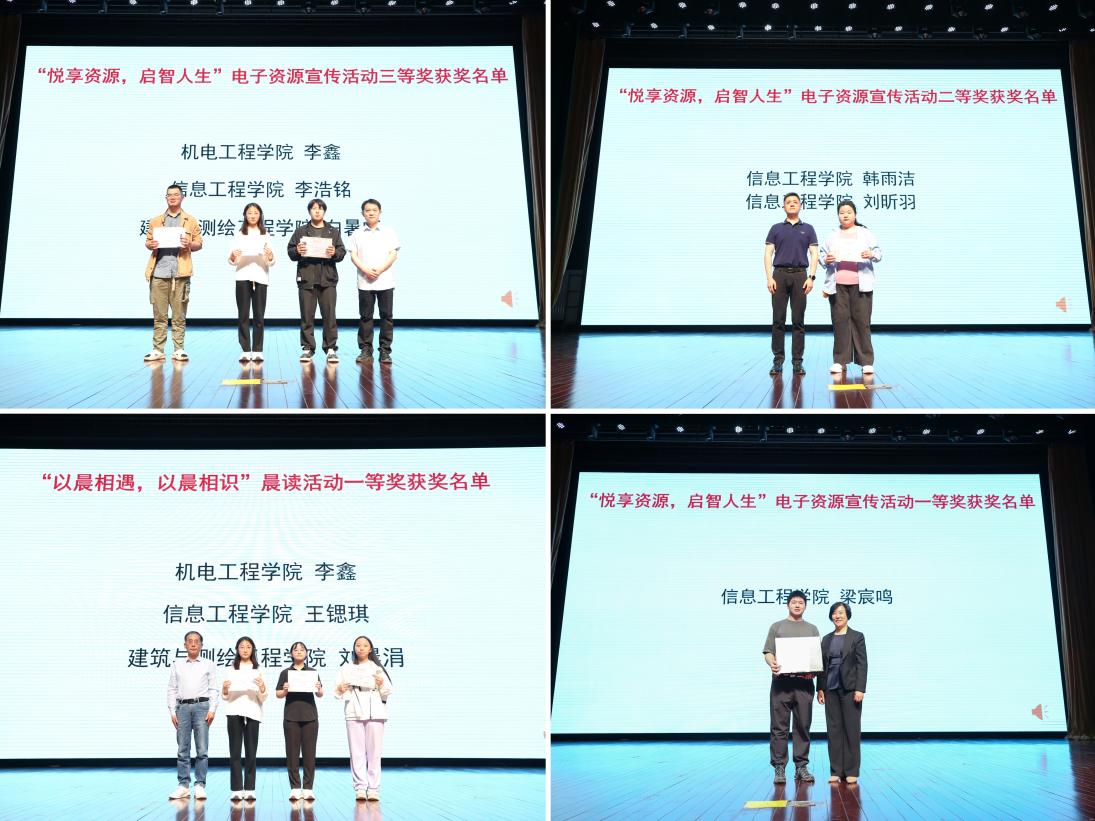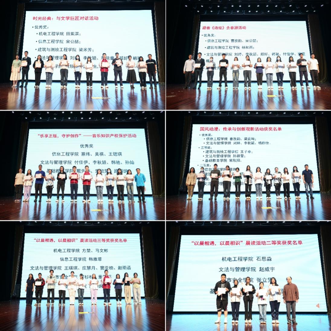 颁奖典礼对读书月七大活动中表现优异的师生现场颁发荣誉证书和奖品。七大活动分别为时光经典:与文学巨匠对话、跟着《诗经》去春游、“乐享正版,守护创作”——音乐知识产权保护活动、国风动漫:传承与创新观影活动、“以晨相遇,以晨相识”晨读活动、2024年阅读之星、“悦享资源,启智人生”电子资源宣传活动。