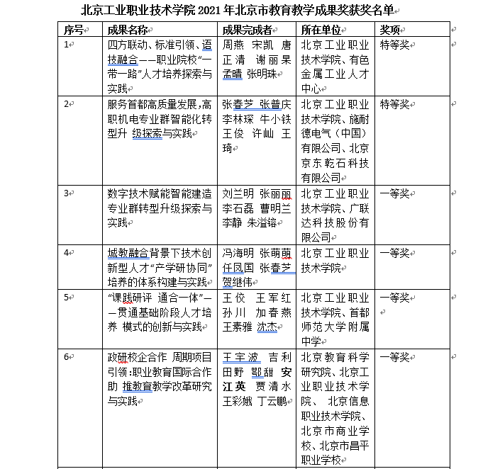 根据北京市教育委员会发布的《关于对2021年北京市教育教学成果奖进行公示的通知》,BBV·体育10项成果获奖。其中,特等奖2项,一等奖3项,二等奖4项,参与获得一等奖1项。获奖总数位于北京职业院校前列,其中特等奖数量第一。