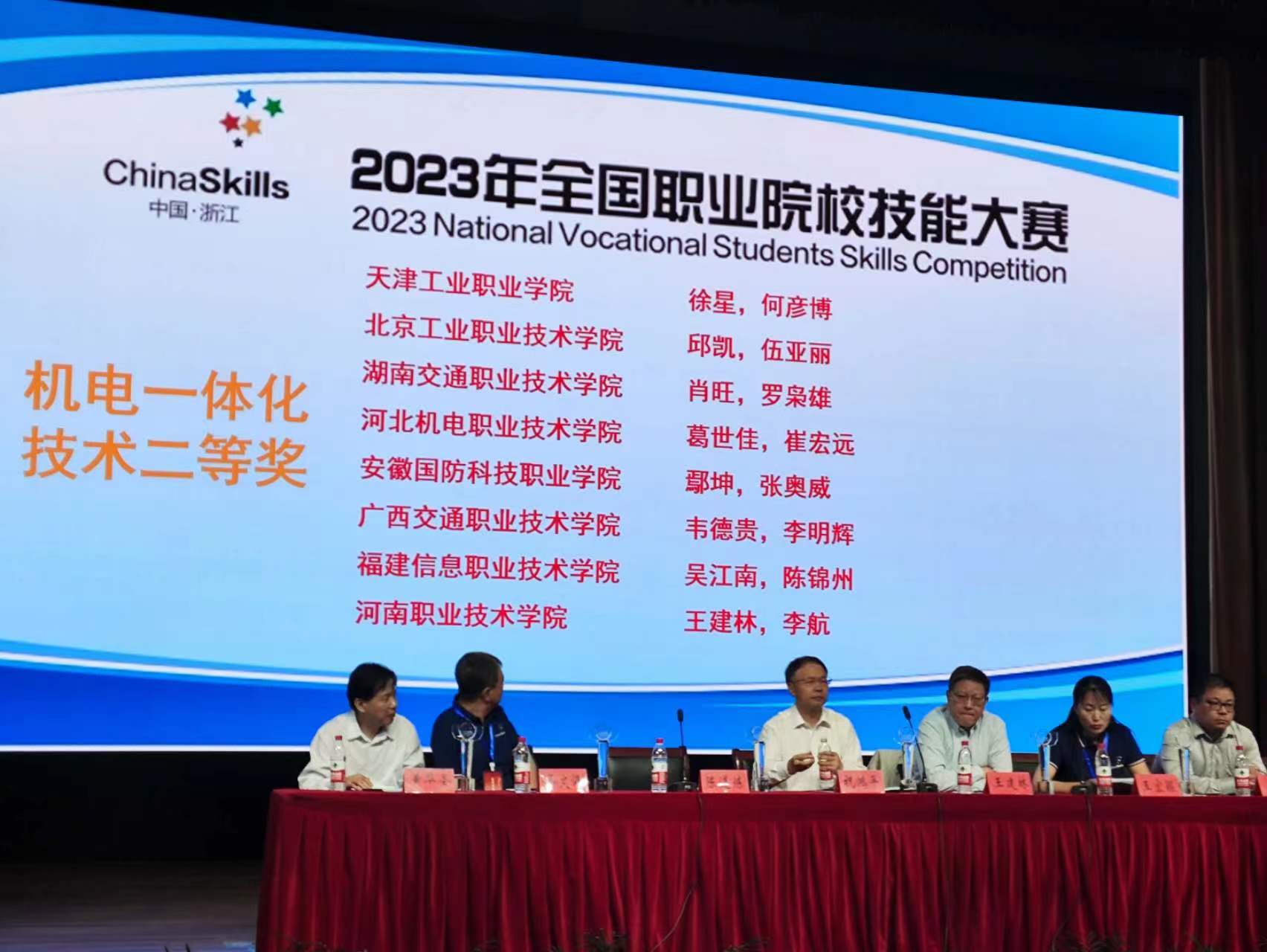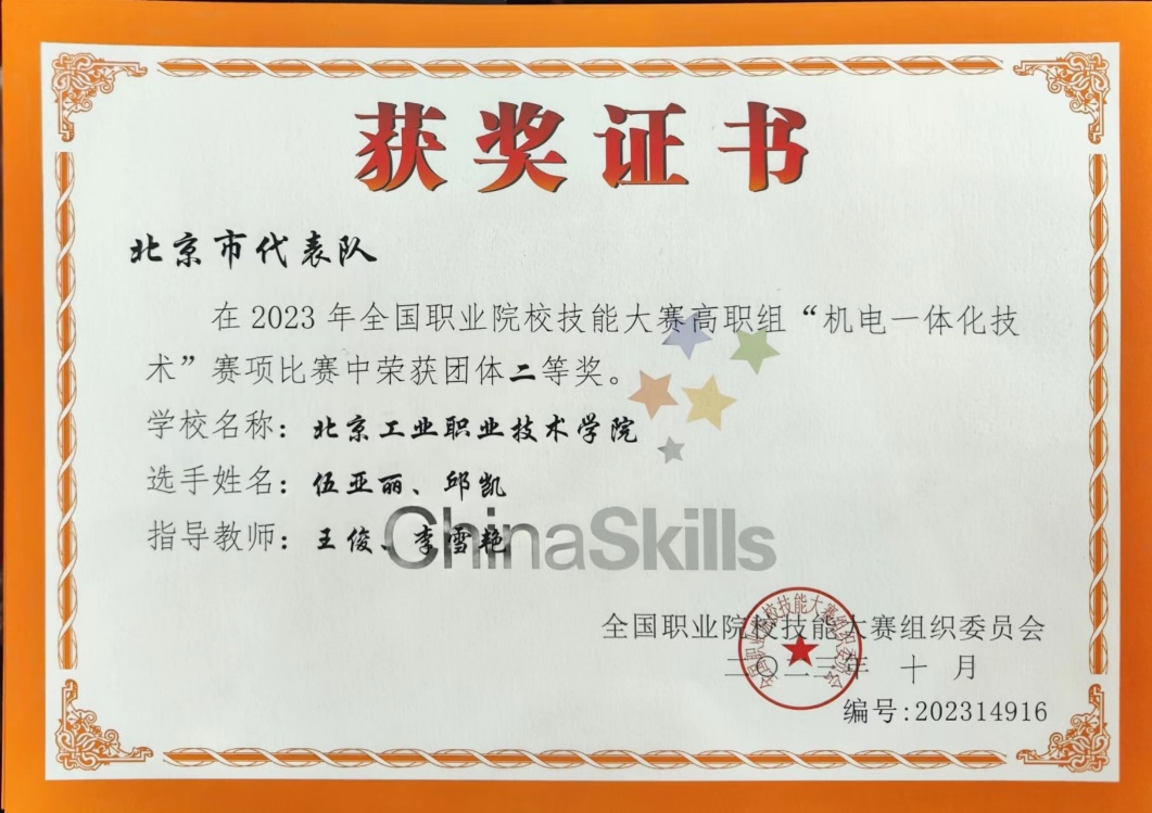 2023年10月14日至17日,全国职业院校技能大赛高职组“机电一体化技术”赛项在浙江杭州举办。来自全国的79所高职院校优秀代表队同台竞技。我校机电学院参赛队作为北京市 “机电一体化技术”赛项代表队参与此项赛事。经过两天的激烈角逐,机电工程学院机电一体化专业学生邱凯、伍亚丽最终取得第10名的成绩,斩获全国二等奖。