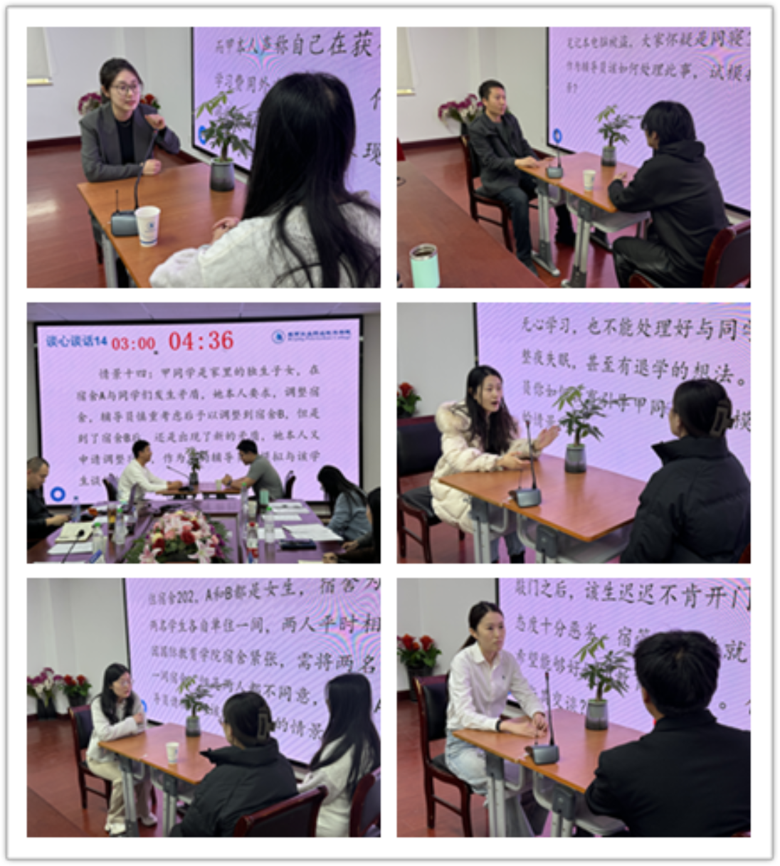12月19日的现场比赛由谈心谈话和案例分析两个环节组成。谈心谈话环节包括选手抽题、现场准备、场景模拟、赛后总结、评委提问。在参赛选手和助演学生生动的情景演绎中,辅导员们坚持解决思想问题和实际问题相结合的原则,循循善诱、为学生提供科学可行的对策,动之以情、晓之以理,以沉着冷静的态度处理学生问题、解答学生疑惑。整个谈话过程贴近实际、寓情于理、精彩纷呈。